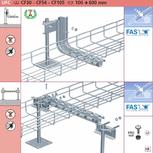 可上下调节,UFC+CSN适用于宽300mm以下的桥架,超过此宽度需采用UFS+RCSN方式